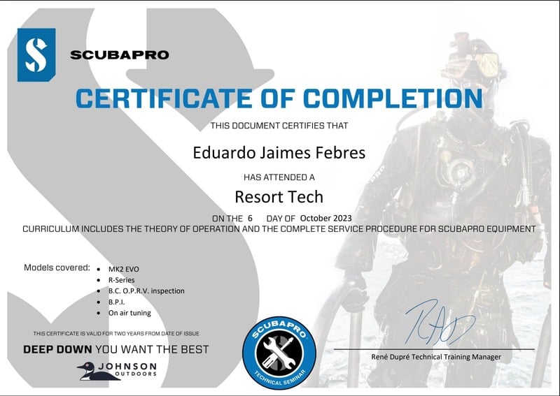 Centro de servicio técnico especializado y autorizado Scubapro y Dive Rite, que respeta la continuidad de la garantía del fabricante. En la constante búsqueda de ser los mejores del mercado y garantizar la calidad de nuestro servicio, nuestros técnicos certificados están constantemente actualizándose. Realizamos revisión, mantenimiento y reparación de válvulas, reguladores, BCD, cambio de batería en computadoras y otros dispositivos electrónicos.